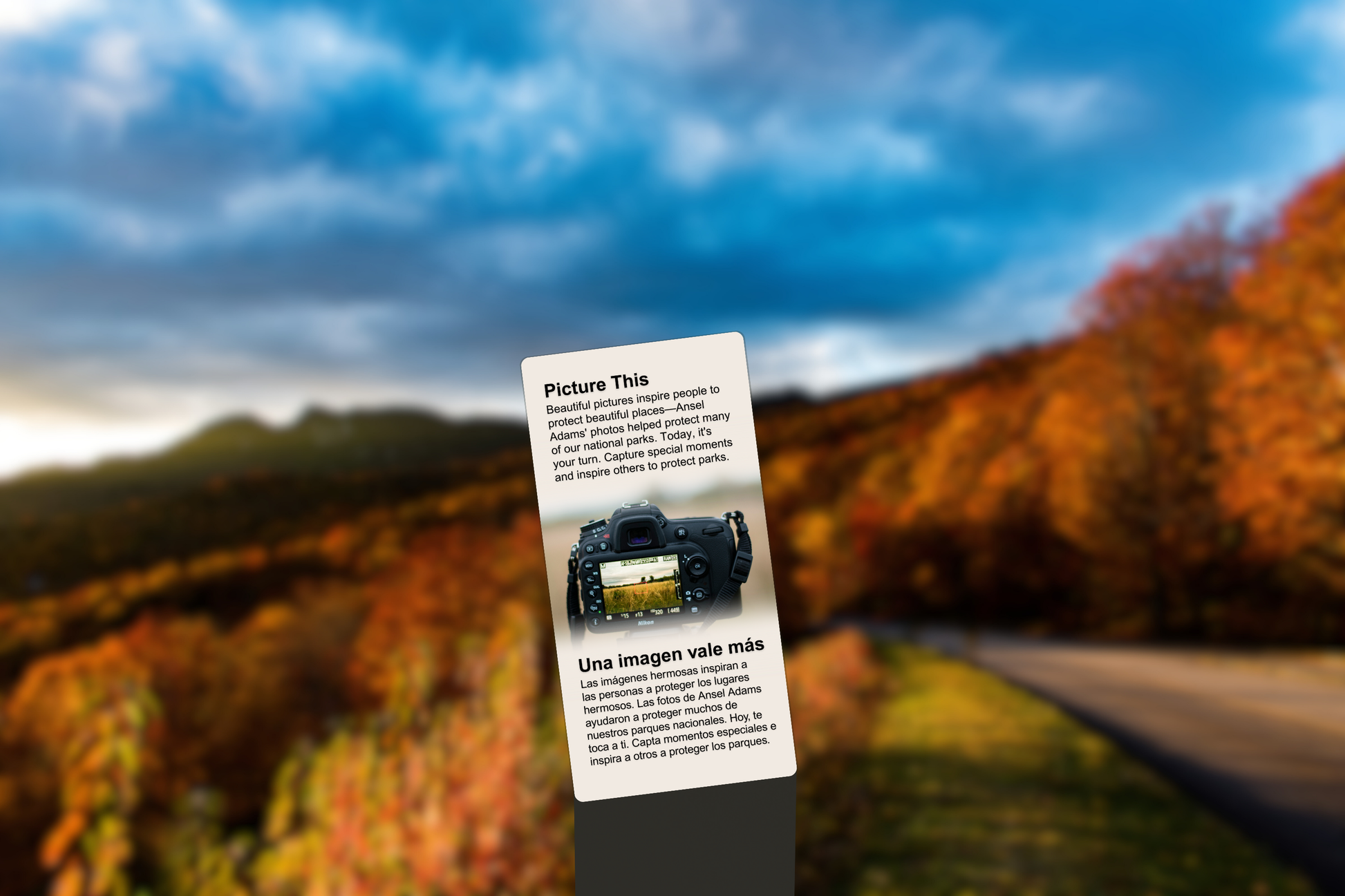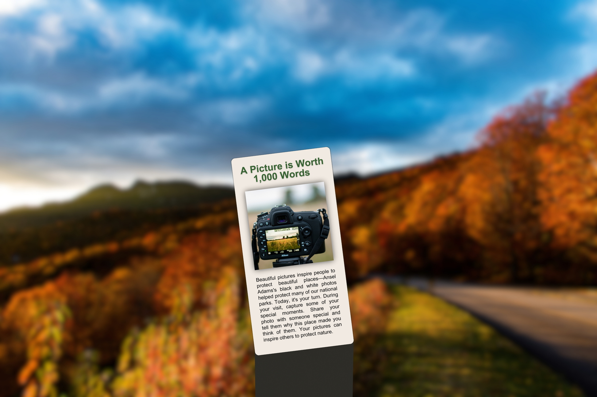 Sign Text: "Beautiful pictures inspire people to protect beautiful places—Ansel Adams's black and white photos helped protect many of our national parks. Today, it's your turn. During your visit, capture some of your special moments. Share your photo with someone special and tell them why this place made you think of them. Your pictures can inspire others to protect nature."