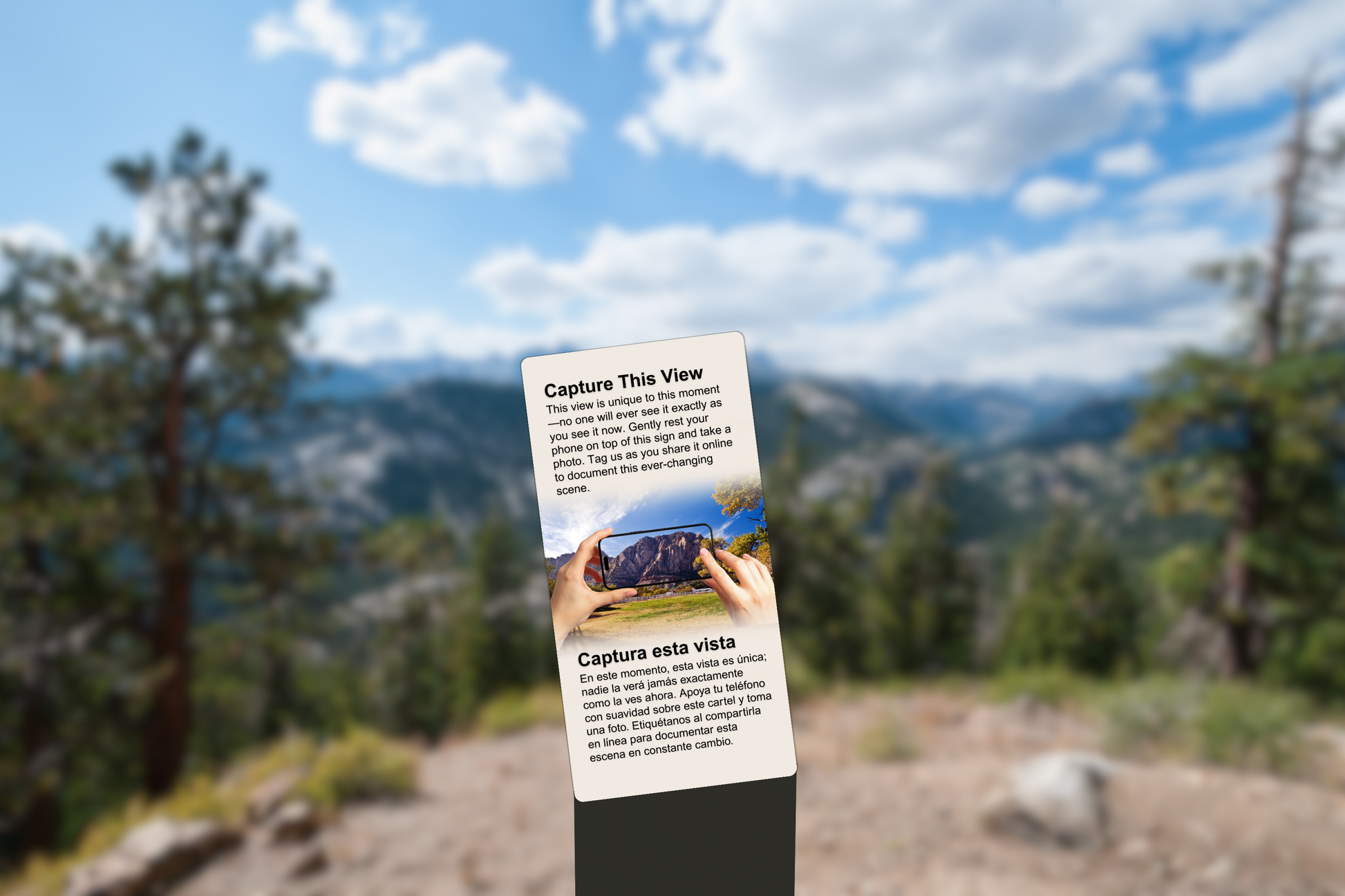 Sign Text: "This view is unique to this moment—no one will ever see it exactly as you're seeing it right now. Weather, erosion, time, and human activity subtly change the shape of this landscape every day. Gently rest your phone on the top of this sign to take a photo, then share it with #Example to see how it's changed and join others in documenting this ever-changing scene."
