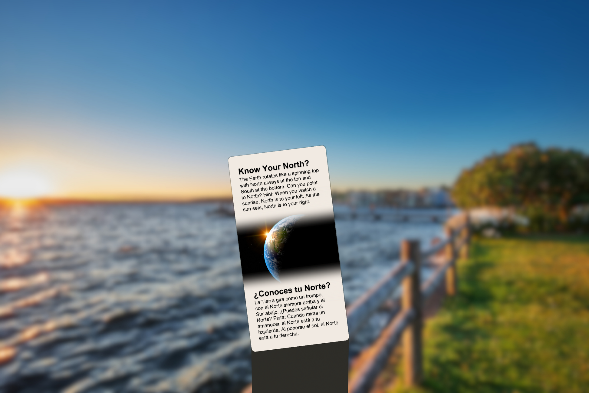 Sign Text: "The Earth rotates like a spinning top with North always at the top and South at the bottom. Many birds and butterflies use internal compasses to navigate during migration, but we can use the Sun as our guide. When you watch a sunrise, North is to your left. When you watch a sunset, North is to your right. Like a migrating bird, can you point to North?"