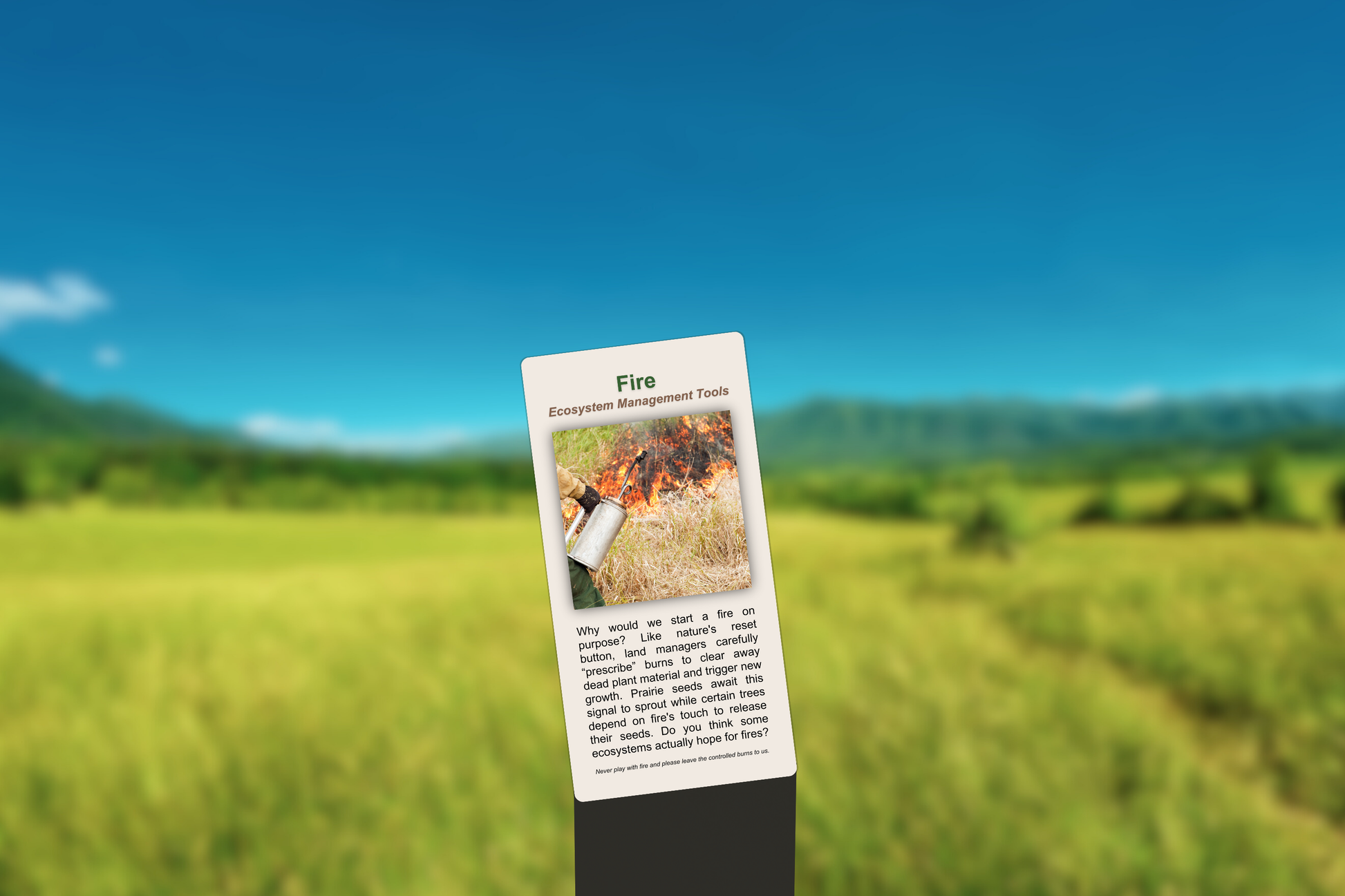 Sign Text: "Why would we start a fire on purpose? Like nature's reset button, land managers carefully “prescribe” burns to clear away dead plant material and trigger new growth. Prairie seeds await this signal to sprout while certain trees depend on fire's touch to release their seeds. Do you think some ecosystems actually hope for fires? Never play with fire and please leave the controlled burns to us."
