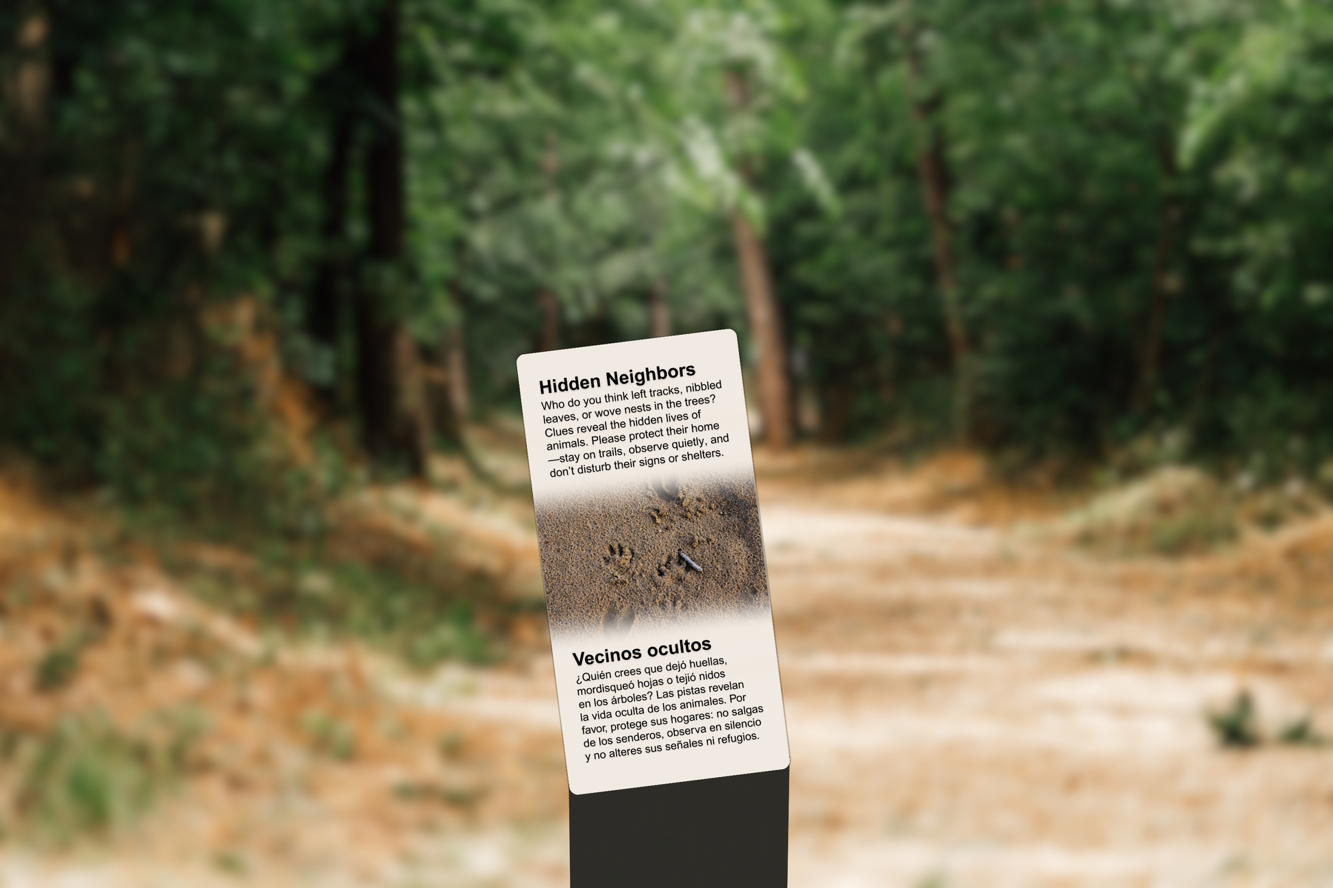 Sign Text: "Be a wildlife detective! Look for clues like tracks in the dirt, nibbled leaves, or woven nests tucked among branches. These subtle signs reveal the secret lives of animals even when they stay hidden. As you explore, remember to protect their home—stay on trails, observe quietly, and never disturb their signs or shelters. Who do you think left behind each clue?"