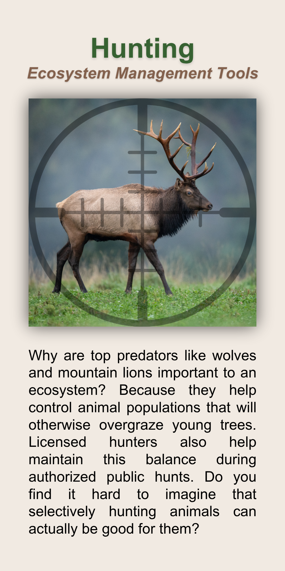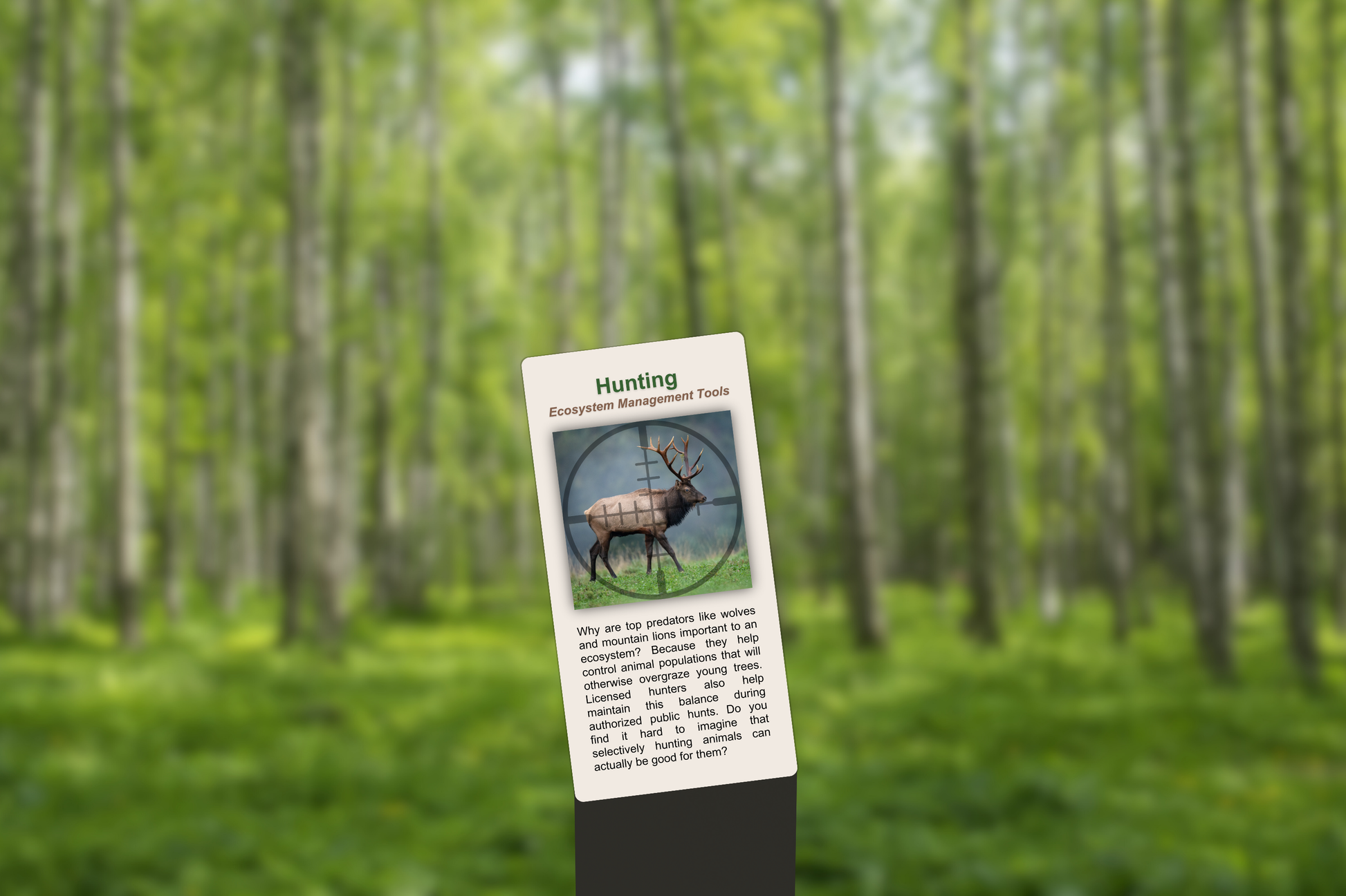 Sign Text: "Why are top predators like wolves and mountain lions important to an ecosystem? Because they help control animal populations that will otherwise overgraze young trees. Licensed hunters also help maintain this balance during authorized public hunts. Do you find it hard to imagine that selectively hunting animals can actually be good for them?"