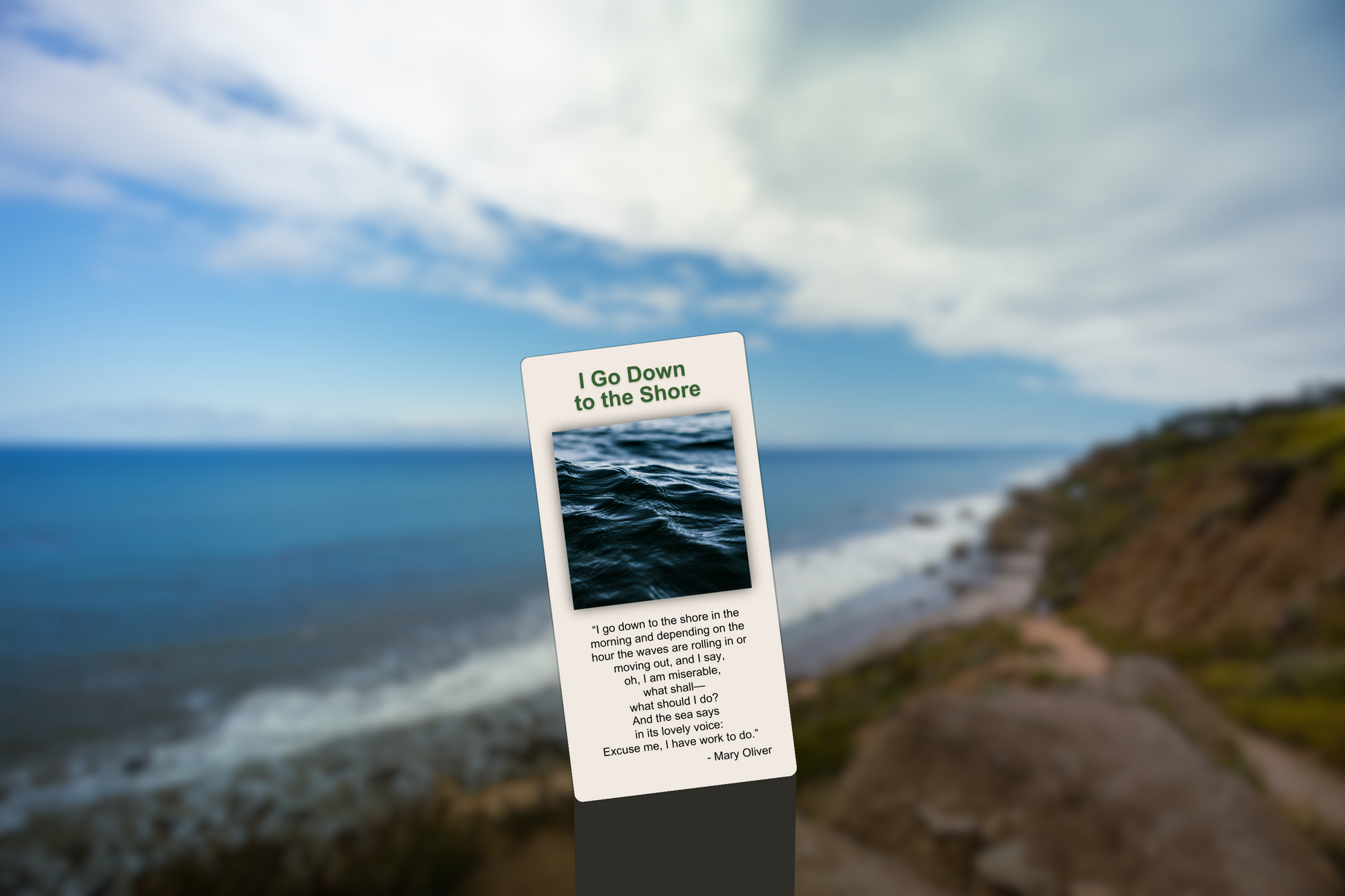 Sign Text: “I go down to the shore in the morning and depending on the hour the waves are rolling in or moving out, and I say, oh, I am miserable, what shall—what should I do? And the sea says in its lovely voice: Excuse me, I have work to do.” - Mary Oliver