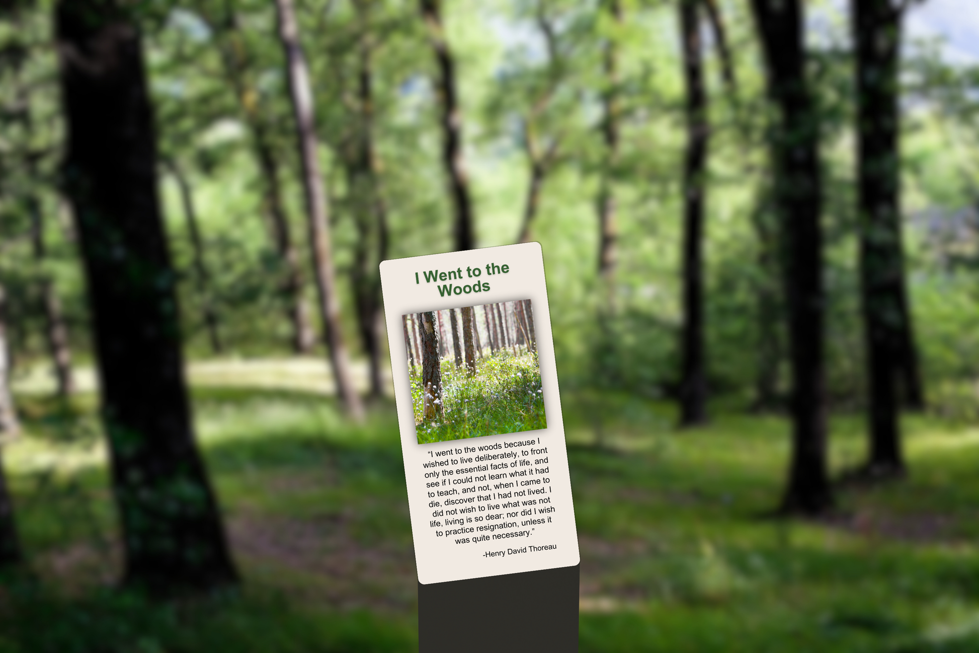 Sign Text: “I went to the woods because I wished to live deliberately, to front only the essential facts of life, and see if I could not learn what it had to teach, and not, when I came to die, discover that I had not lived. I did not wish to live what was not life, living is so dear; nor did I wish to practice resignation, unless it was quite necessary.” -Henry David Thoreau