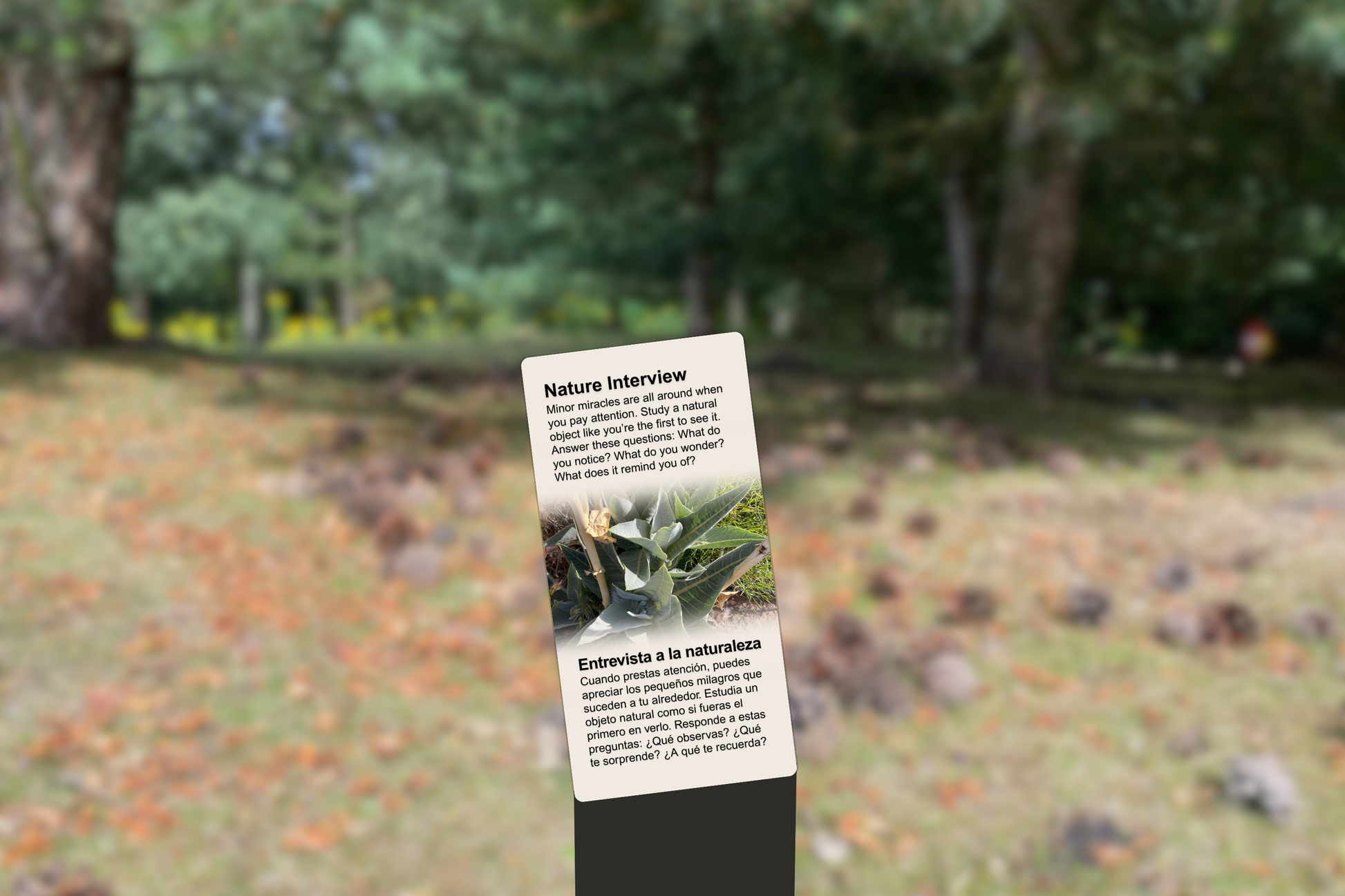 Sign Text: "Every leaf, pebble, and twig holds a world of wonder we can discover when we're curious and pay attention. Find a natural object that catches your eye, maybe a nearby tree, plant, rock, or similar. Study it as if you’re the first person to ever see it and answer these questions: What do you notice? What do you wonder? What does it remind you of?"