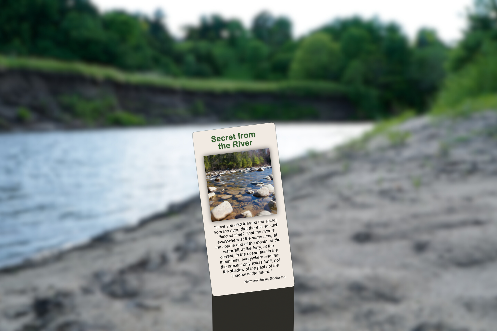 Sign Text: “Have you also learned the secret from the river; that there is no such thing as time? That the river is everywhere at the same time, at the source and at the mouth, at the waterfall, at the ferry, at the current, in the ocean and in the mountains, everywhere and that the present only exists for it, not the shadow of the past not the shadow of the future.” -Hermann Hesse, Siddhartha