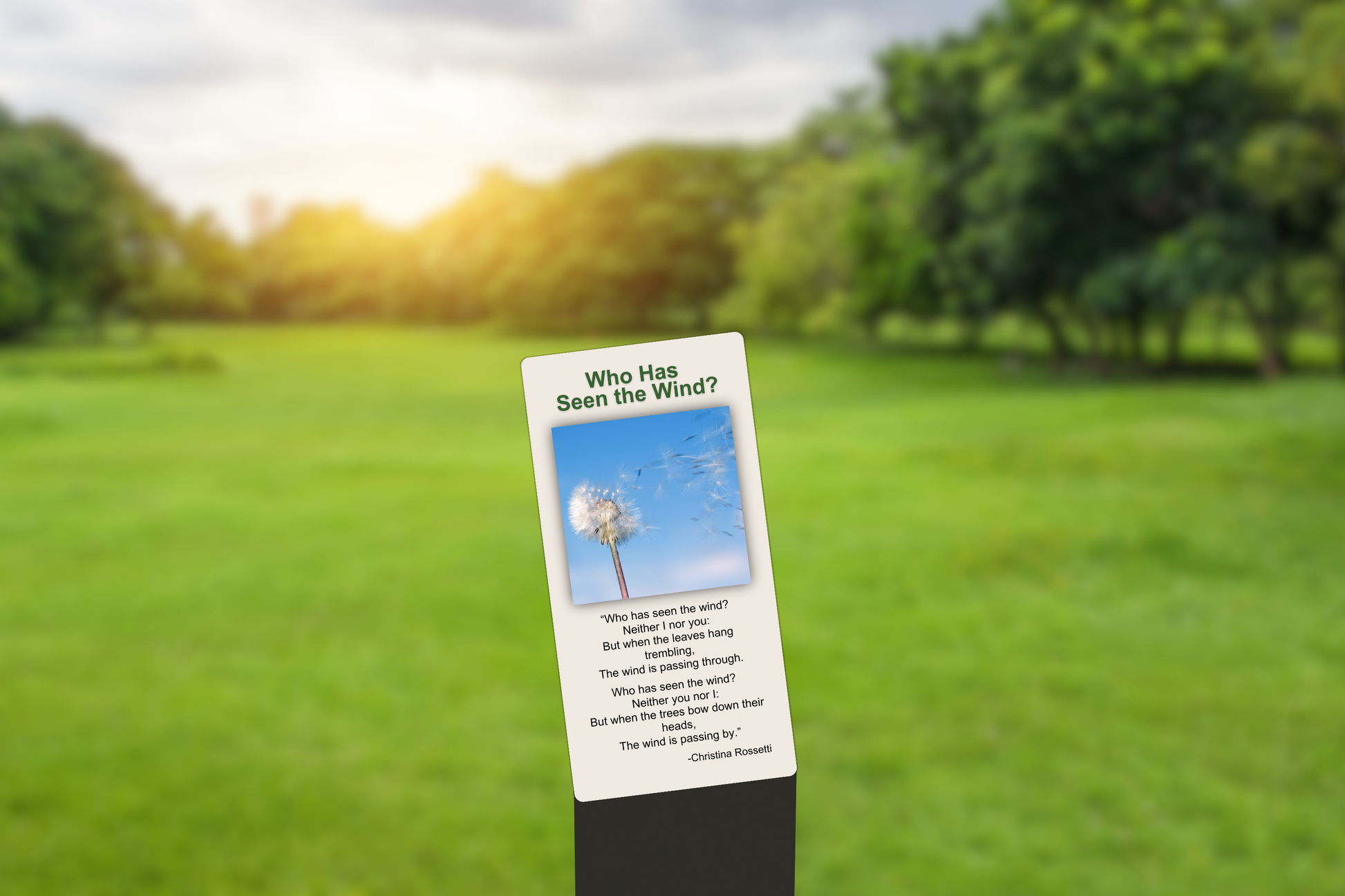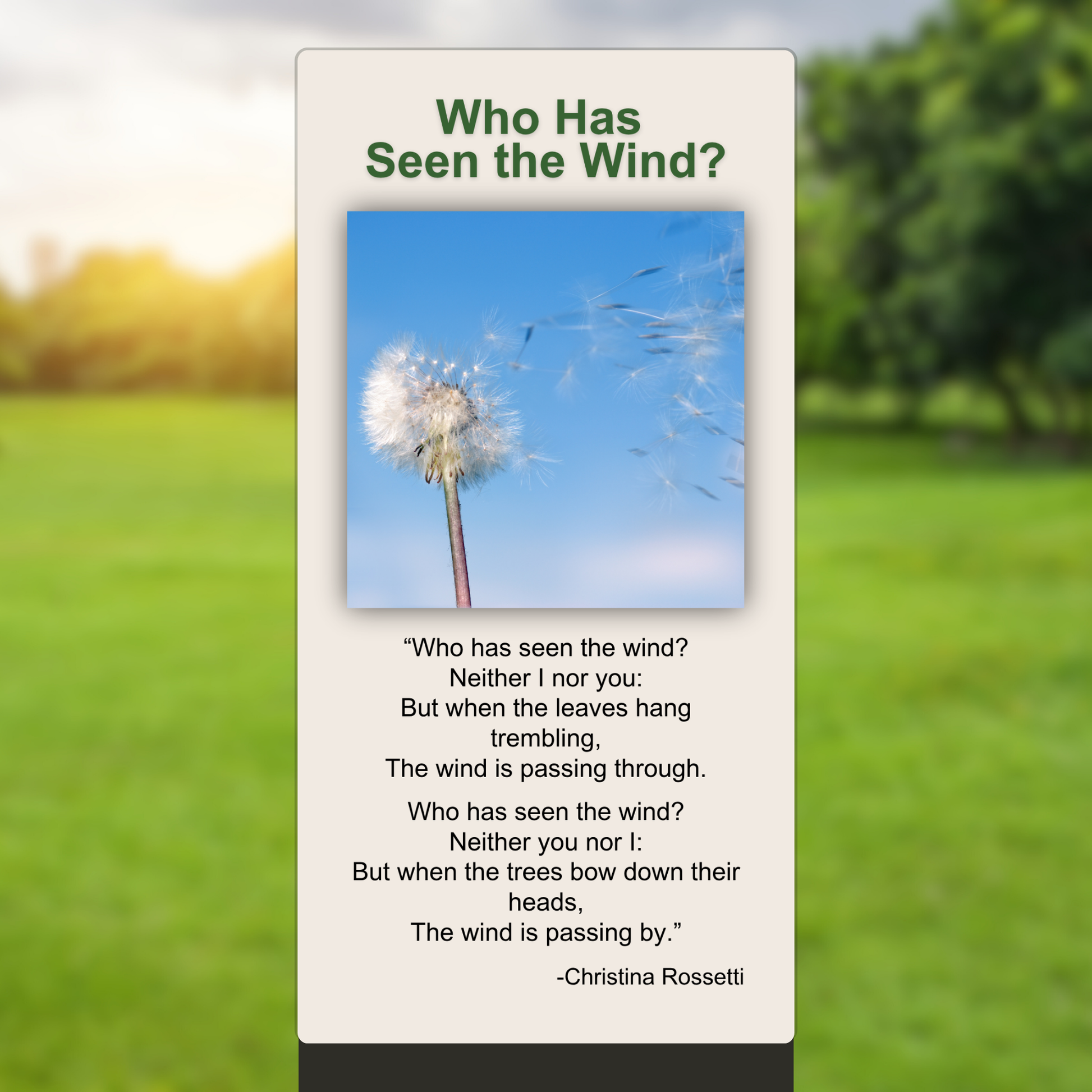Sign Text: “Who has seen the wind? Neither I nor you: But when the leaves hang trembling, The wind is passing through. Who has seen the wind? Neither you nor I: But when the trees bow down their heads, The wind is passing by.” -Christina Rossetti